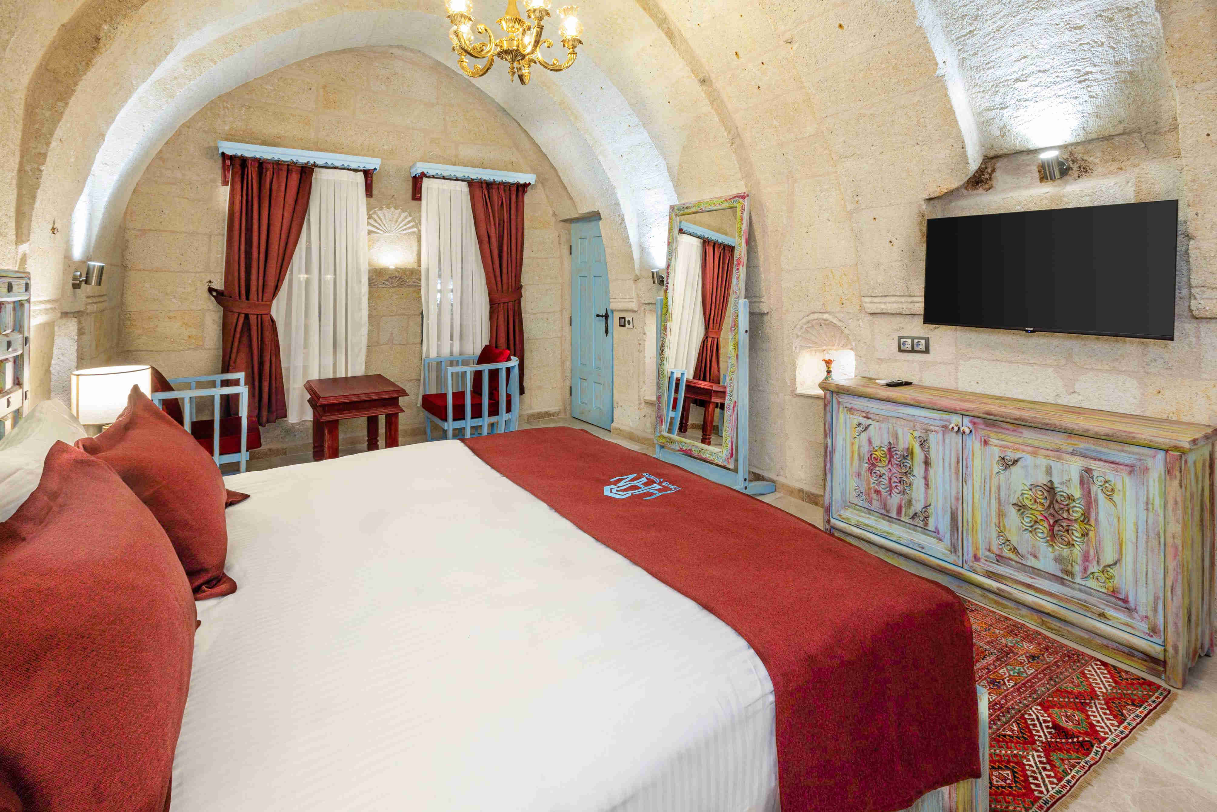 The natural stone walls keep the room cool in the summer and cozy in the winter, offering a perfect year-round retreat. Each Cave Suite is furnished with traditional décor and modern amenities, including a private bathroom and a comfortable seating area. These rooms are perfect for those who want to experience Cappadocia’s historical charm with the convenience of modern living.