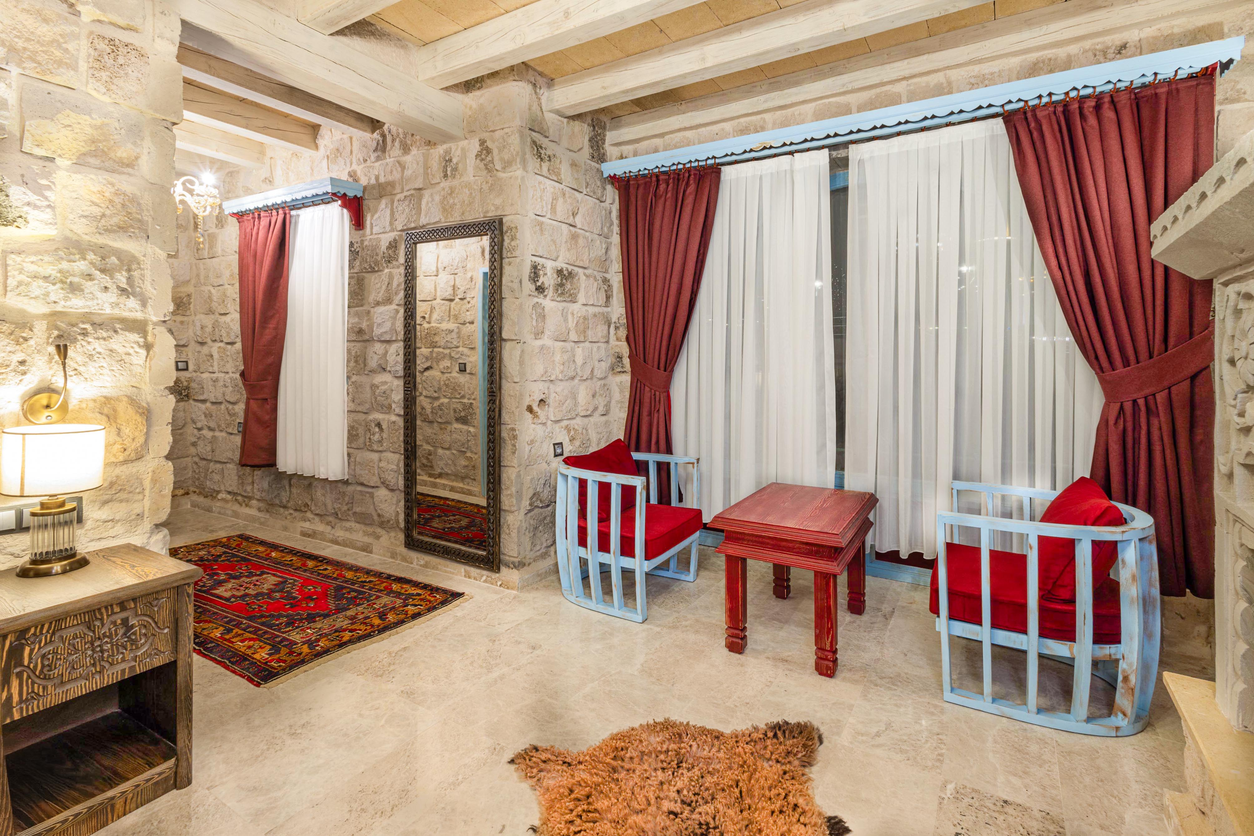 The King Room is the pinnacle of luxury at Han Cave Cappadocia. Offering an expansive layout, this room is designed for guests who want the very best in comfort and style. It features a large bedroom with a king-size bed, a spacious living area, and a panoramic view of the Cappadocian landscape. This room is ideal for special occasions, such as honeymoons or anniversaries, where every detail contributes to a memorable stay.